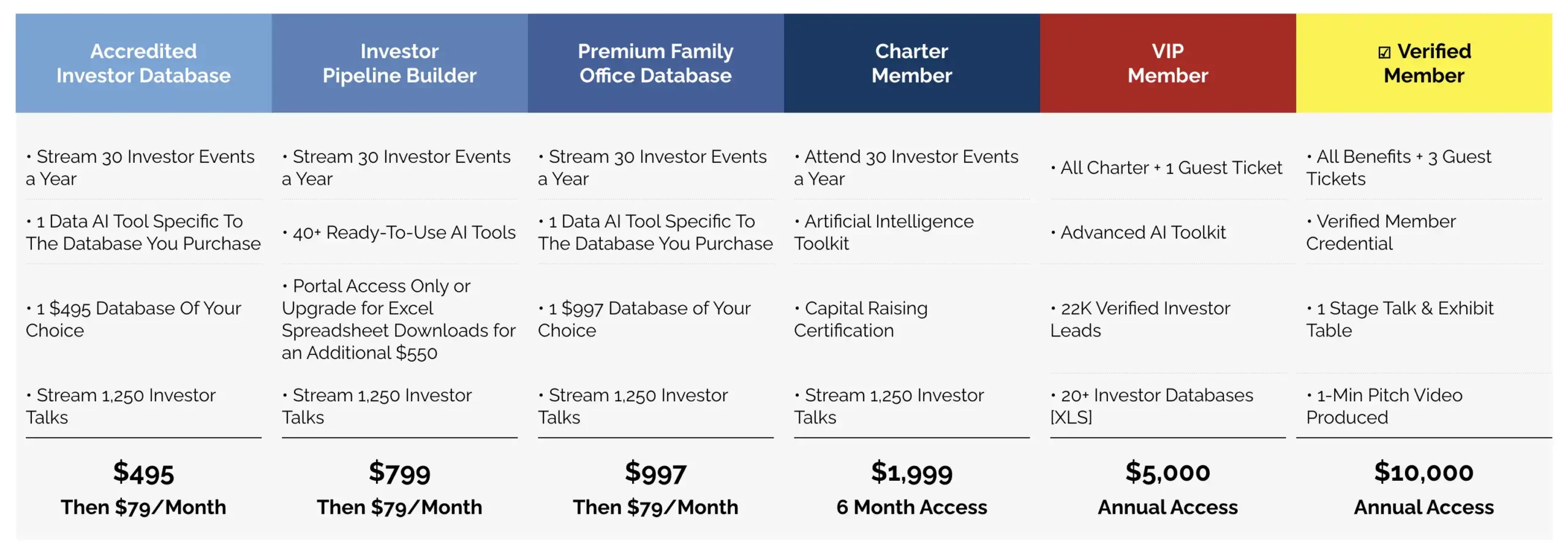 Grow and raise capital 33% faster: Family Offices control $14 trillion, and after $1 billion in deals done while hosting 300 events over 18 years, we know nothing beats shaking hands with capital partners face-to-face. In fact, Cialdini proved that in-person is 16x as effective for closing deals. Our investor club unlocks connections with 1,000 active investors, 25 investor events yearly, 40 exclusive AI tools, and a mobile app to stream 1,000 investor videos.