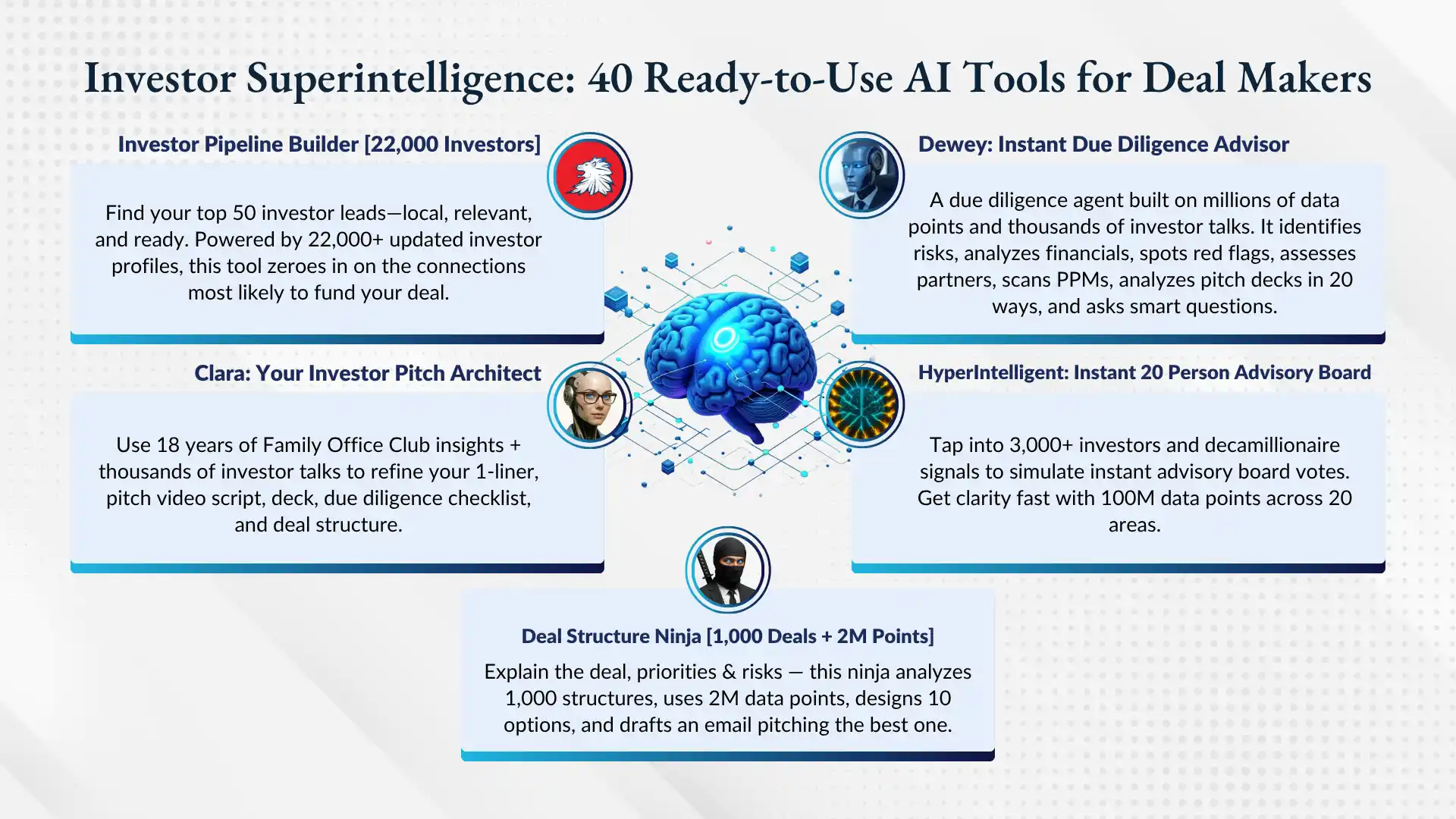 These AI tools help you laser-target ideal investors, compress your pitch into an irresistible one-liner, auto-generate tailored deal structures from a 1,000-template vault, mine insights from 3,000+ investors, and apply 4 million data points to help you grow.